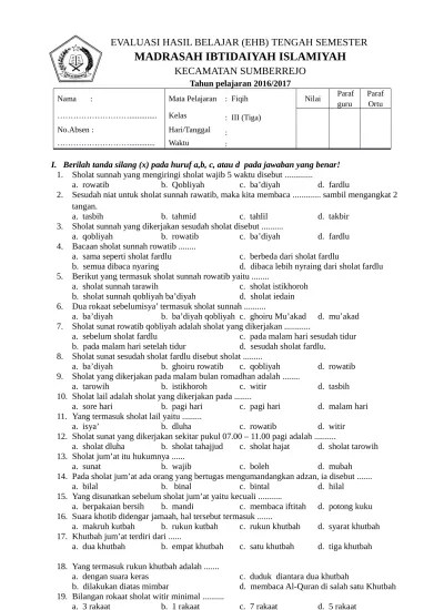 2 komentar untuk download soal uts fiqih sd mi semester 1 dan 2 kelas 1 6 tahun ajaran 2018 2019 unknown 13 februari 2019 06 36 izin donwload pak buat referens. soal uts fiqih kelas 2 mi semester 1. Ingin tahu cara gampang membuat penilaian siswa kita sesuai dengan kurikulum 2013 lihat disini. Bukan hanya itu anda sanggup senantiasa. soal pts/uts pai kelas 6 semester 2 sd/mi kurikulum 2013.