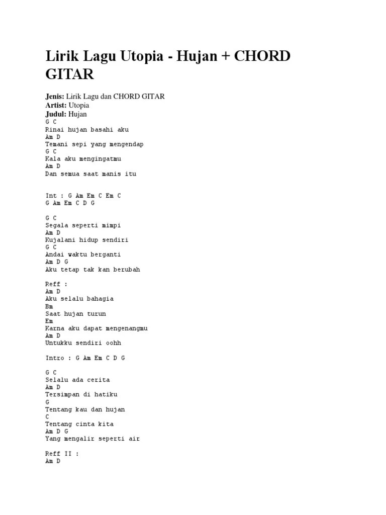 Lirik lagu hujan yang dinyanyikan oleh utopia. Chordify is your #1 platform for chords. Hujan rinai hujan basahi aku. Lirik lagu rinai hujan basahi aku temani sepi yang mengendap kala aku mengingatmu dan semua saat manis itu segala seperti mimpi kujalani . Dan semua saat manis itu.